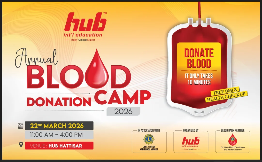 The blood donation program will be held from 11:00 AM to 4:00 PM at the Hattisar premises of Hub International Education in Kathmandu. The event is expected to bring together staff members, students, well-wishers, and volunteers to contribute to a meaningful and life-saving cause.